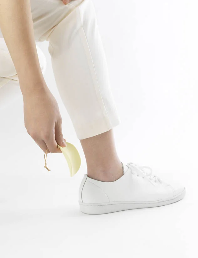 Kai bandžiau sugalvoti minimalistinį batų šaukšto dizainą, supratau, kad forma labai panaši į bulvių traškučio formą. Priešingai nei įsivaizdavau, juo patogu naudotis. Galite pritvirtinti jį prie savo krepšio arba nešiotis paslėptą rankinėje, ištraukus gali būti puiki pokalbio pradžia.