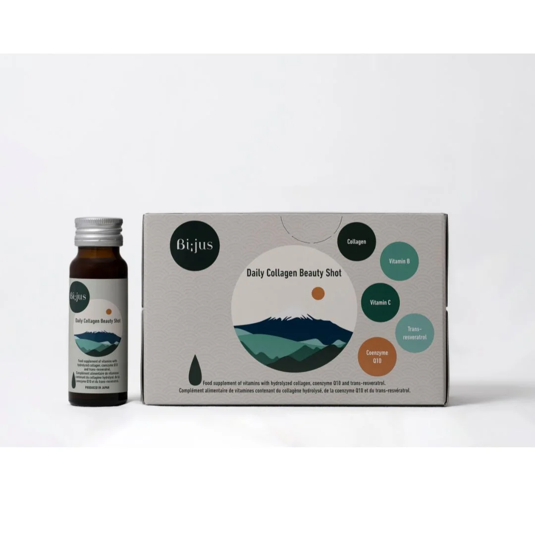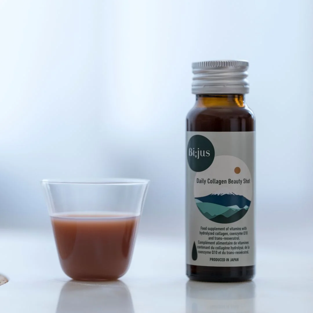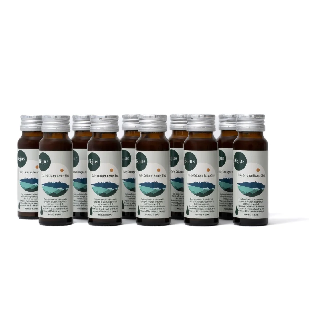 Bi;jus japoniškas kolagenas yra gėrimas, turtingas grožio ingredientų, tokių kaip peptidinis kolagenas, trans-resveratrolis, vitaminai B ir C, kofermentas Q10 ir medus.