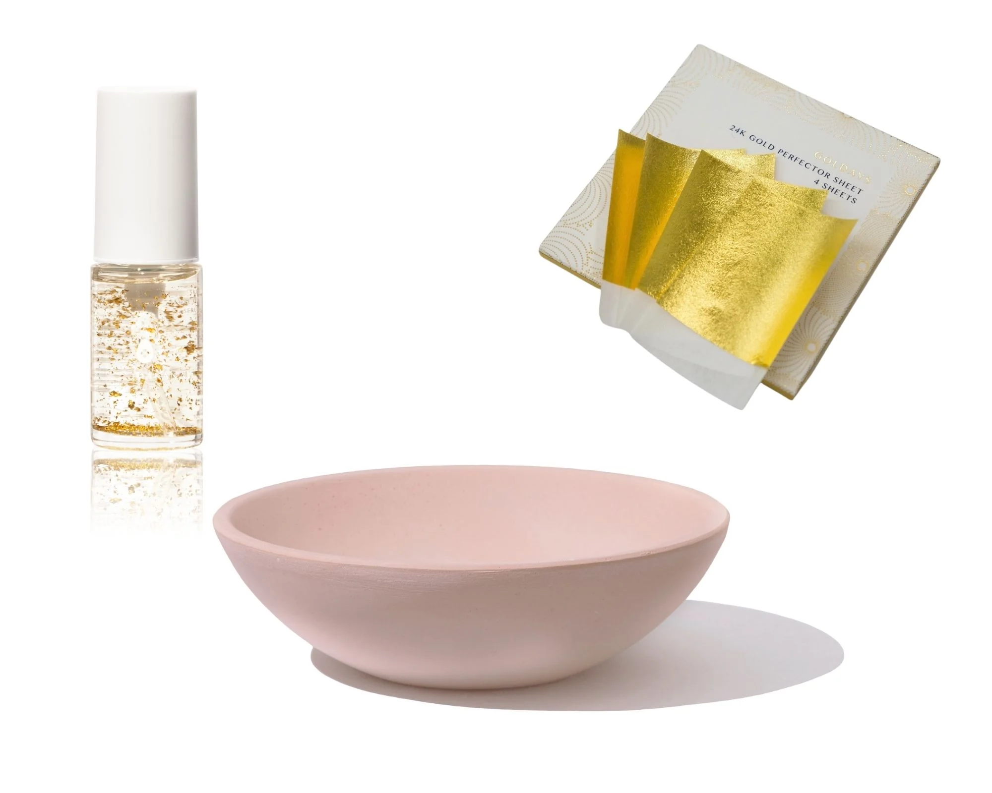 Dovana moteriai „Ryto ritualai” – aukso serumo, 24 karatų aukso ir aksesuarų lėkštutės rinkinys.