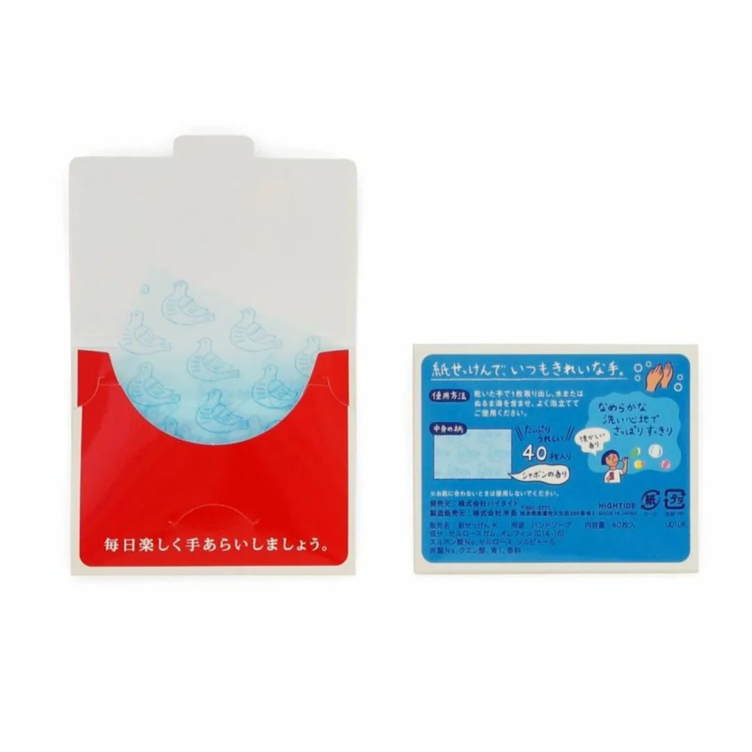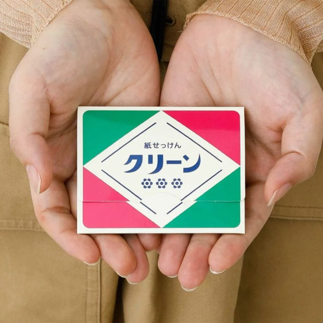 Kišenėje telpantis pakelis talpina 40 muilo lapelių su linksmu, retro stiliaus dizainu. Kiekvienas lapelis, naudojamas su vandeniu, putoja kaip įprastas muilas.