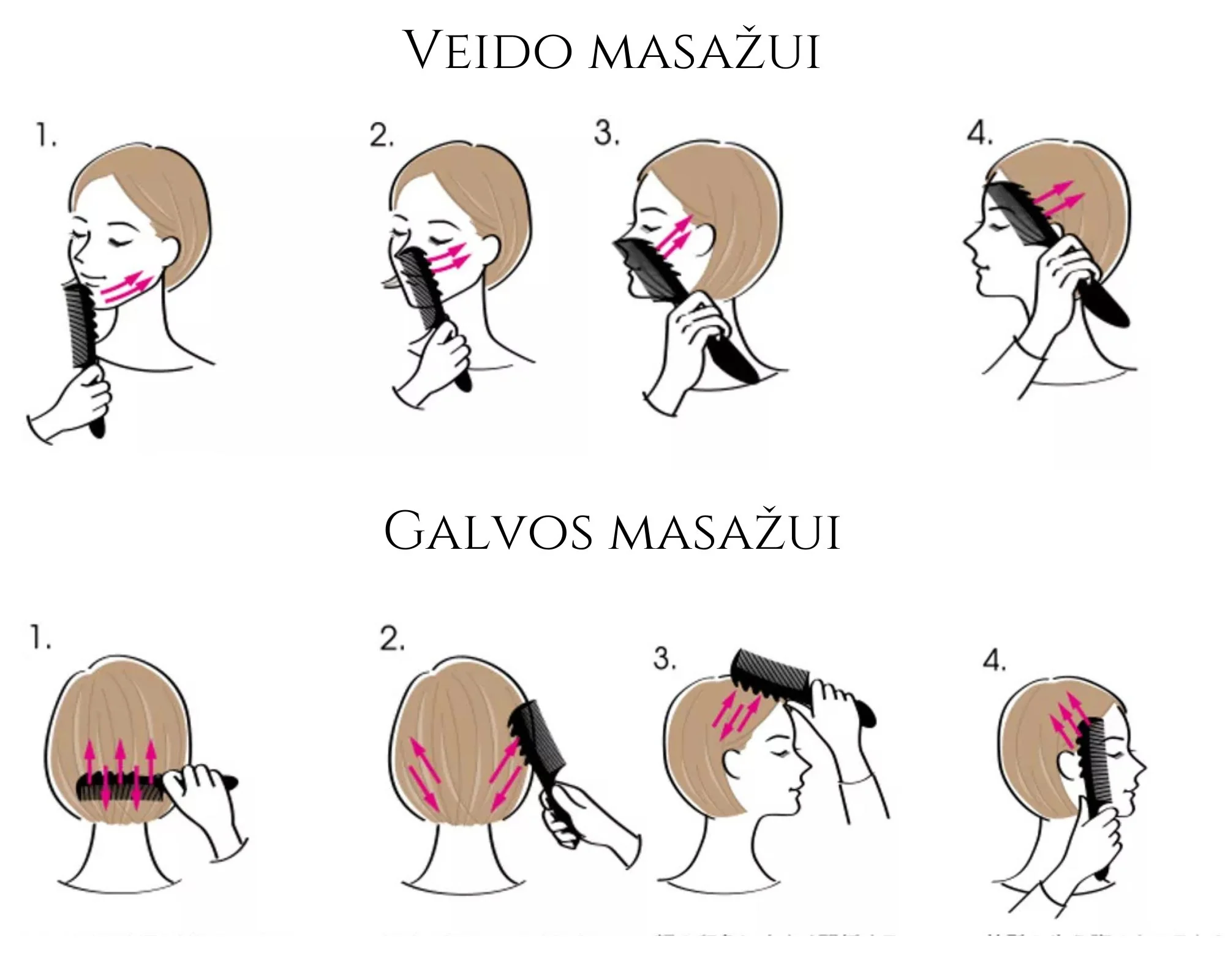 GuaSha bangos, esančios šukų viršūnėje, švelniai stimuliuoja galvos ovalą, pakaušį ir plaukų liniją. GuaSha dalį galima naudoti veido masažui – masažuokite nuo smakro apačios iki skruostų, taip pat smilkinių zoną. Naudojant GuaSha stimuliuojama galvos oda ir kraujotaka, todėl oda ir plaukai būna sveikesni.