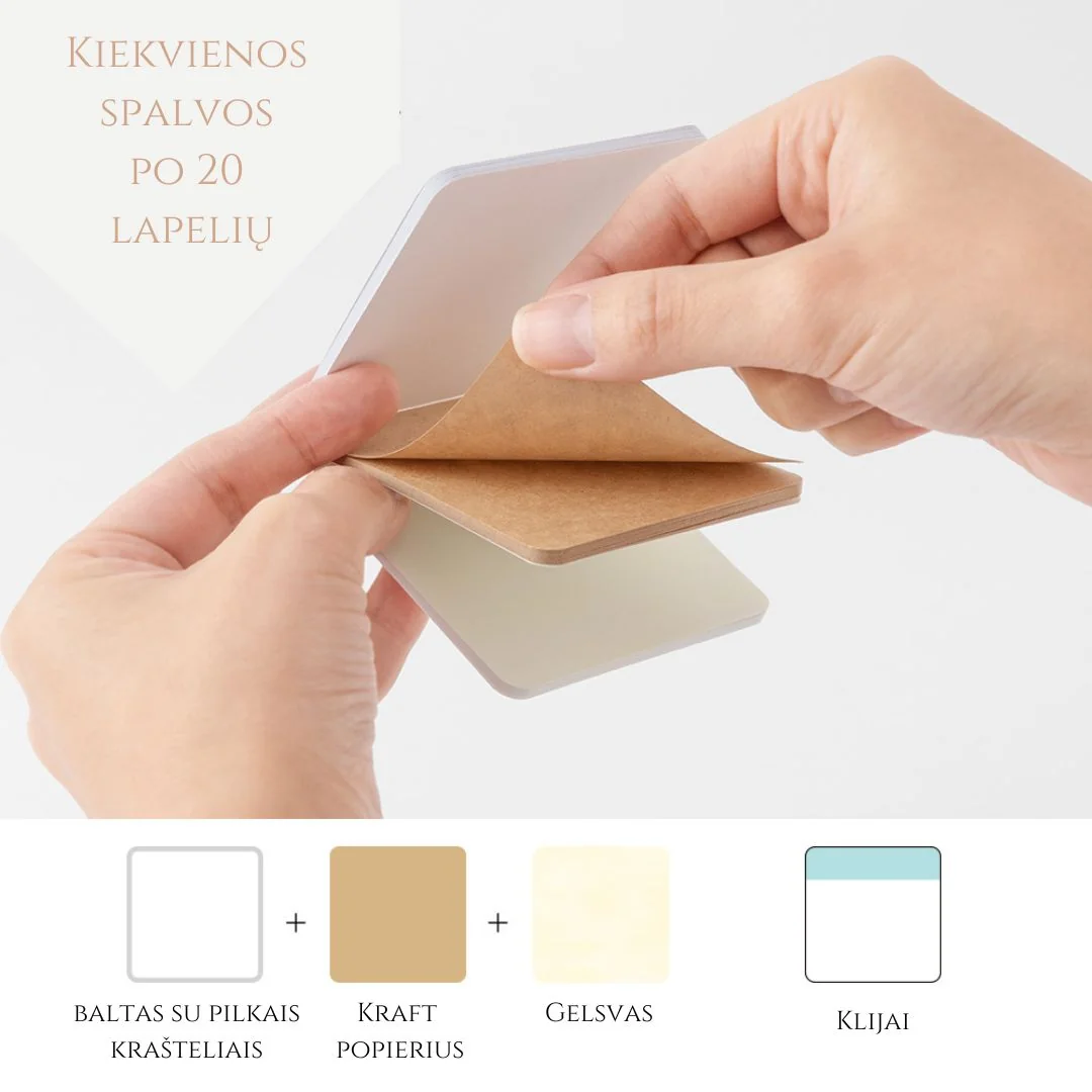 Knygutėje yra 60 aukštos kokybės užapvalintais kampais lapelių: 20 baltų lapelių su pilku krašteliu (pilku rėmeliu), 20 kraftinio popieriaus lapelių ir 20 gelsvų lapelių.