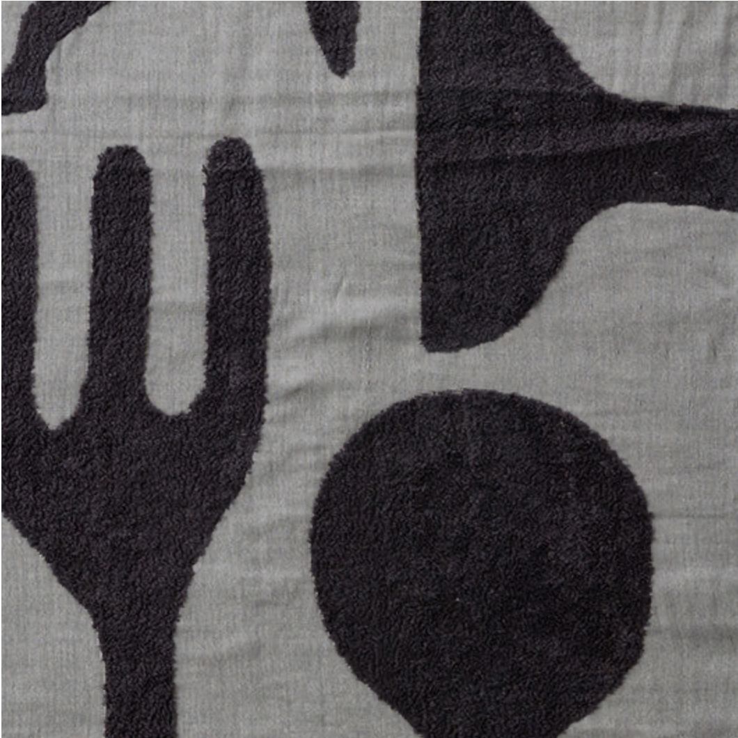 Rankšluostis pasižymi malonia, tačiau tuo pačiu stora tekstūra, kurią papildo raštuotas virtuvės įrankių motyvas. Šis žaismingas dizainas suteikia interjerui subtilų akcentą, kuris lengvai priderinamas prie bet kokio stiliaus. Naudojamos minkštos ir plonos siūlų kilpos purumui sukurti, rankšluostis yra ne tik švelnus, bet ir pakankamai tvirtas. Iš kitos pusės, lengva marlė užtikrina rankšluosčio lengvumą ir puikų drėgmės sugėrimą.