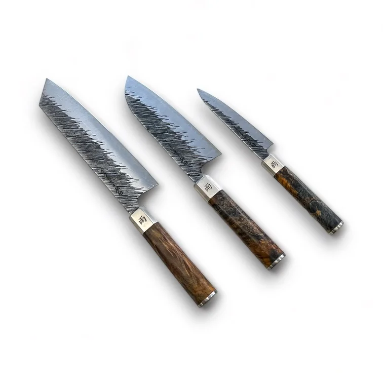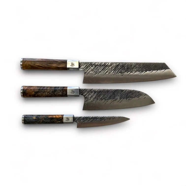 Petty, Santoku ir Kiritsuke – išskirtiniai virtuvės instrumentai, kurie įkūnija Japonijos virtuvės dvasią ir meistriškumą. Visi kartu šie peiliai yra kaip paslaptingas dovanų paketas, kurį atidarant atsiskleidžia įvairiapusiškas virtuvės meistriškumas ir įdomūs kulinarijos potencialai.
