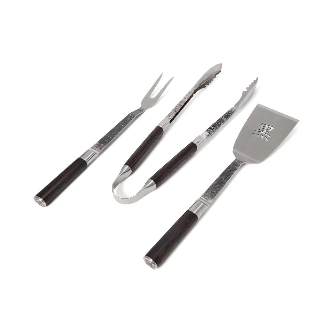 Šis išskirtinis grilio įrankių rinkinys pagamintas iš rankomis kaldinto plieno, kuris ne tik užtikrina ilgalaikį patvarumą, bet ir suteikia įrankiams išskirtinį, autentišką charakterį. Kiekvienas komplekto įrankis turi tamsinto medžio rankeną, kuri ne tik maloni laikyti, bet ir papildo griežtą, bet elegantišką estetiką, būdingą visai Satake KURO serijai. Beje, šio rinkinio gamyba vyksta toje pačioje Japonijos gamykloje, kur gaminami ir puikiai vertinami KURO serijos virtuviniai peiliai, žinomi dėl savo tikslumo ir ilgaamžiškumo.