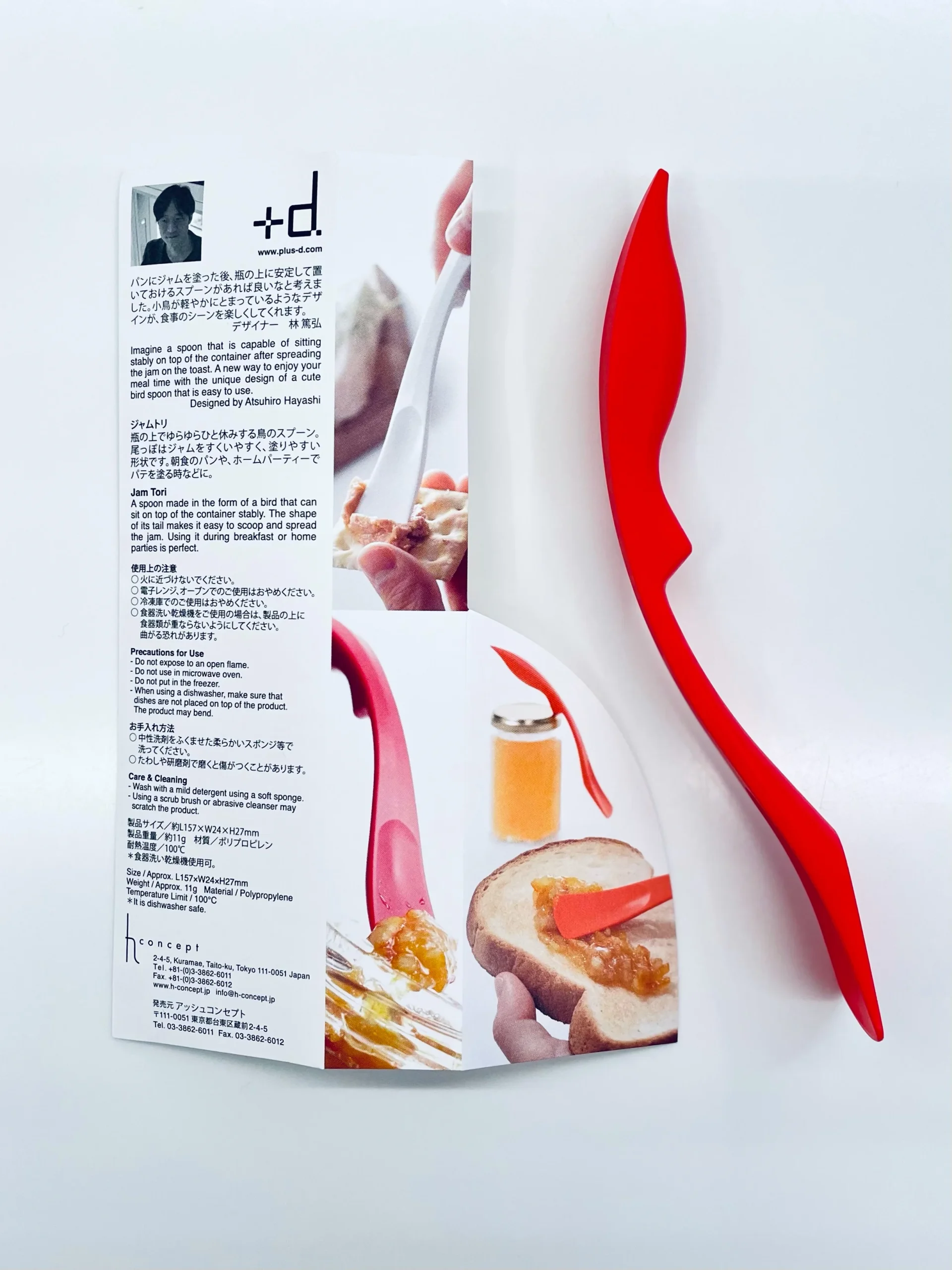 Dizainerio Atsuhiro Hayashi komentaras: Aš įsivaizdavau šaukštą, kuriuo užtepus džemą ant skrebučio, jis laikytųsi ant džemo stiklainio. Naudojant šį unikalų paukščio formos šaukštą, kuriuo itin paprasta naudotis, atsiranda nauja galimybė mėgautis valgymu.