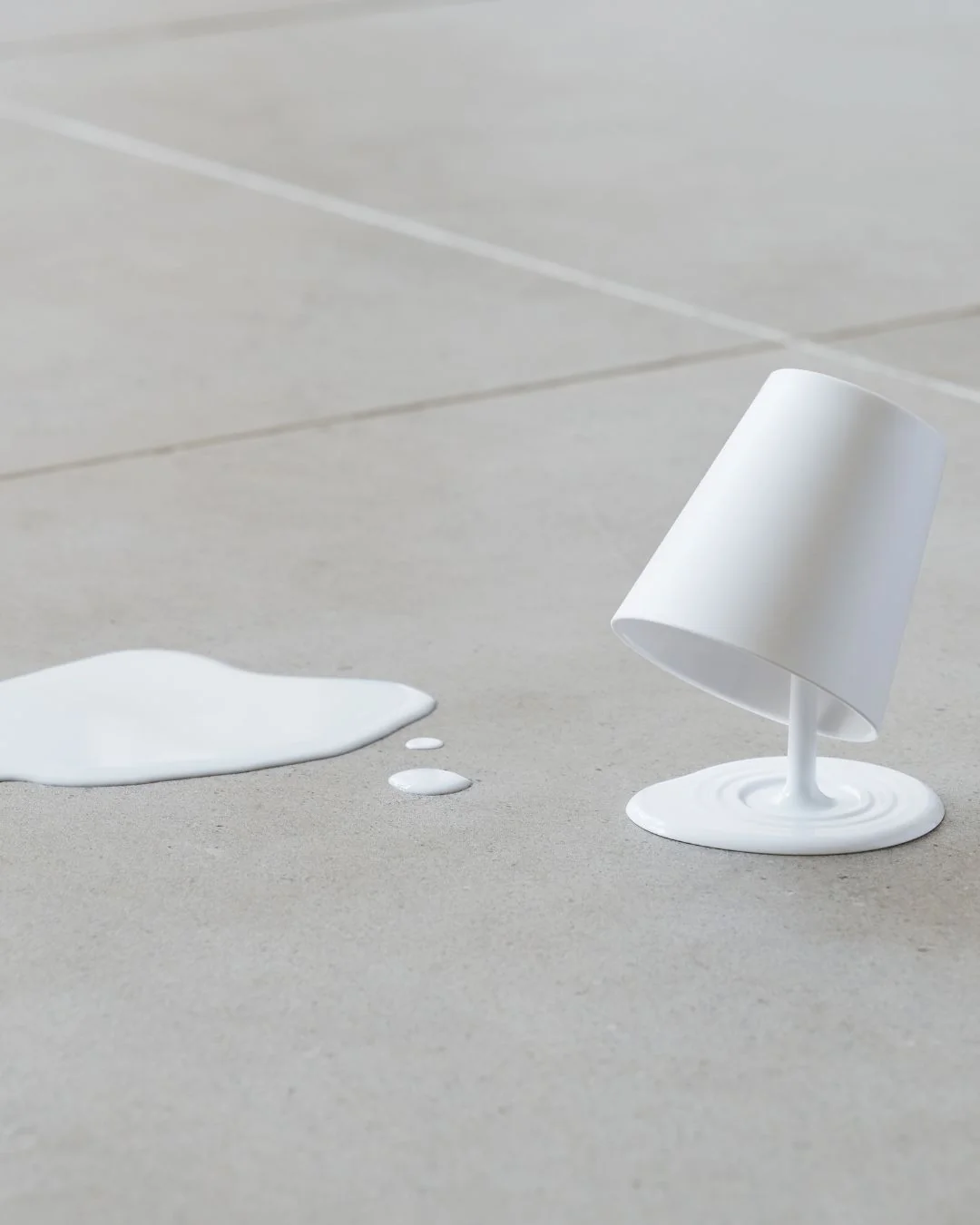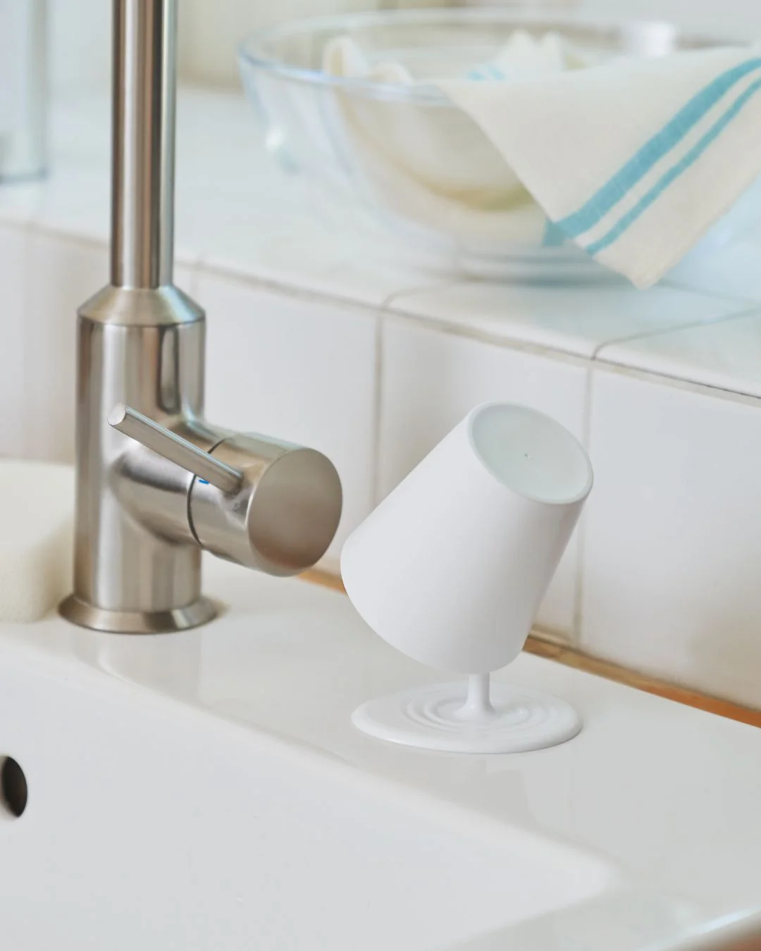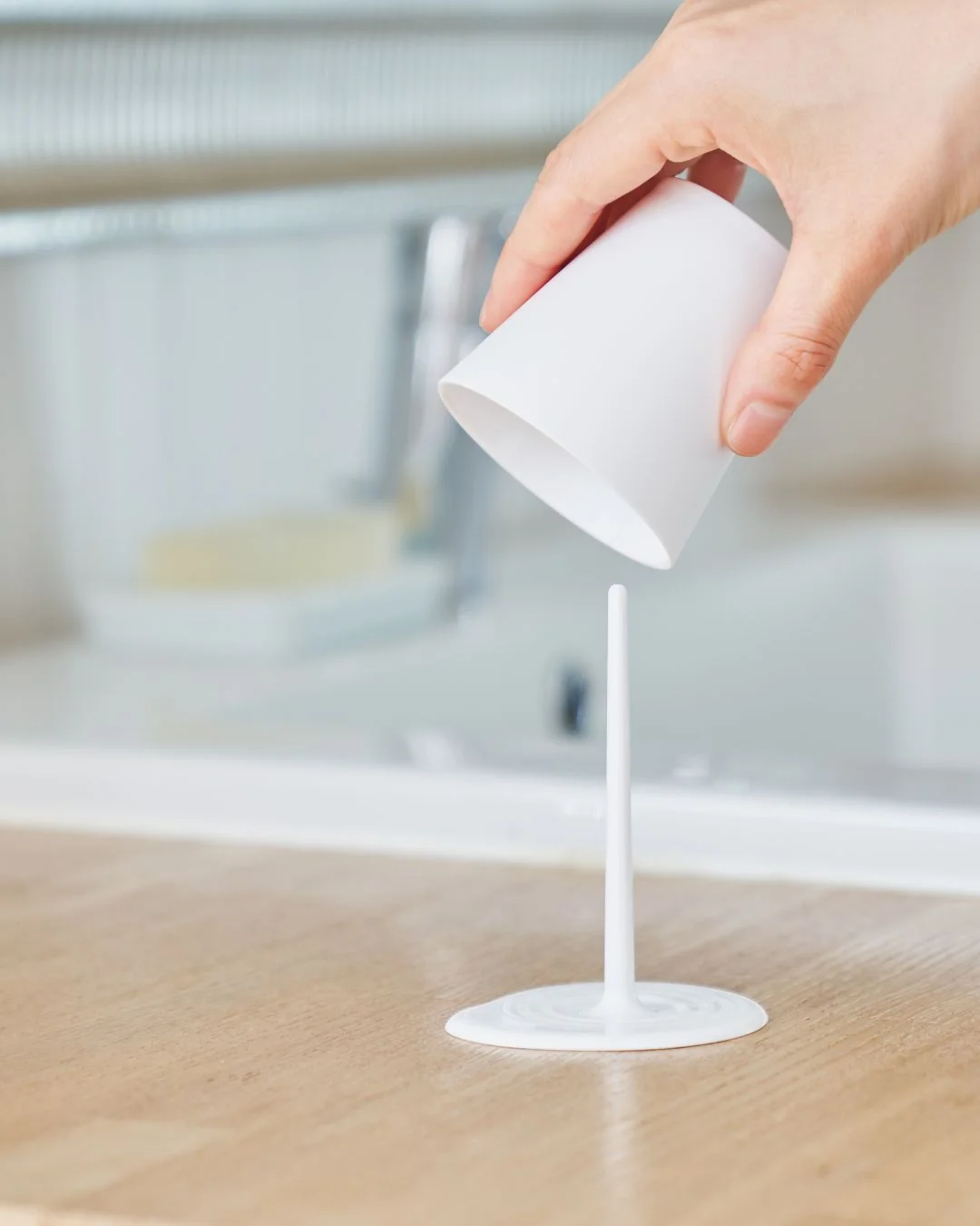 Naudotas puodelis pakabinamas ant stovo išdžiūti, taip sukuriama bėgančio vandens arba pieno iliuzija. Bangomis išmargintas stovo pagrindas efektyviai sulaiko šonu lašančius lašelius.