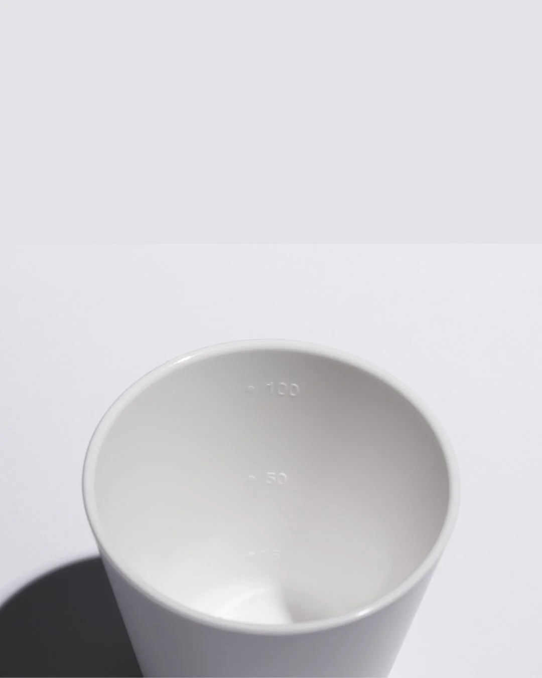 15 ml, 50 ml ir 100 ml nuorodos puodelio vidinėje pusėje