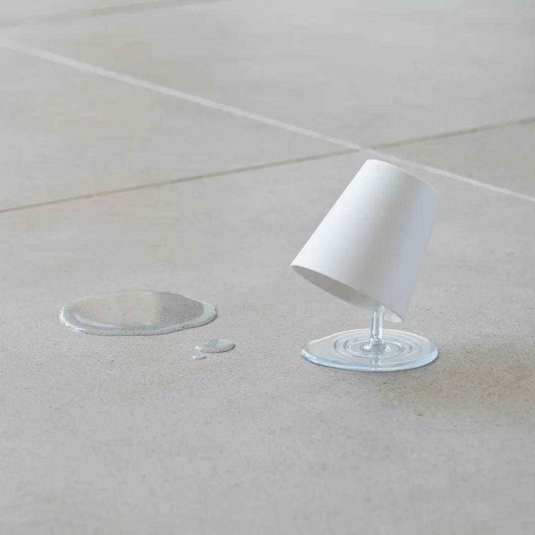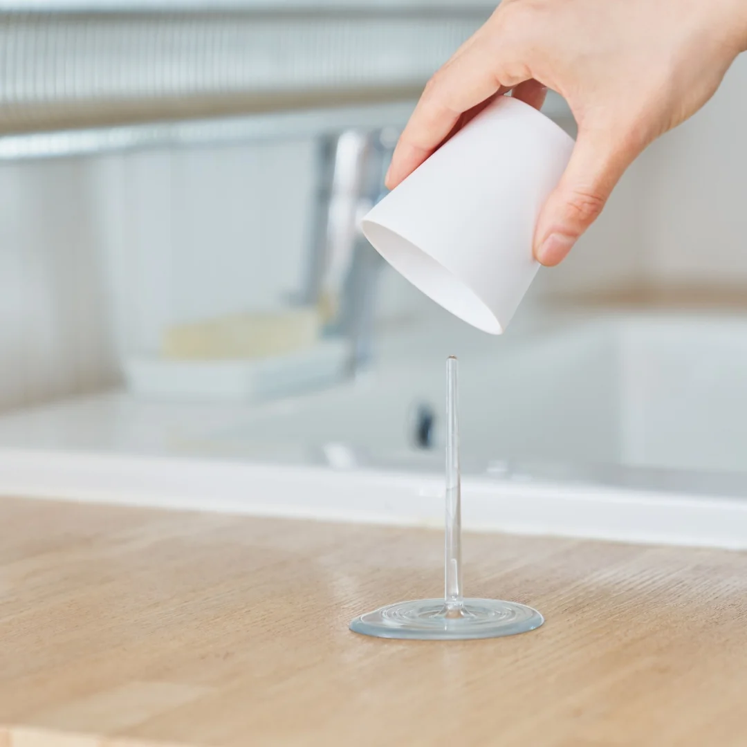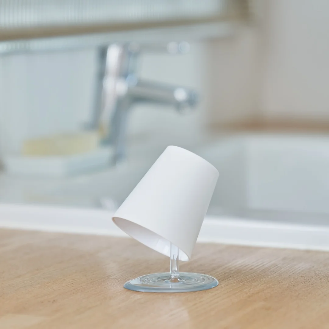 Naudotas puodelis pakabinamas ant stovo išdžiūti, taip sukuriama bėgančio vandens arba pieno iliuzija. Bangomis išmargintas stovo pagrindas efektyviai sulaiko šonu lašančius lašelius.